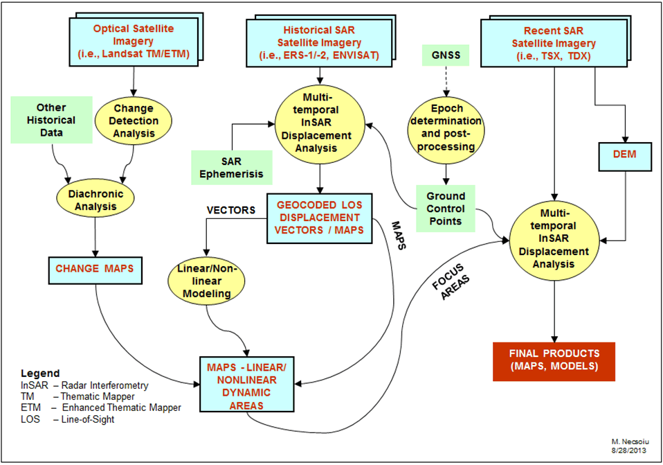Proiectul aplica interferometrie radar bazată pe date satelitare istorice si recente (TSX/TDX) pentru a surprinde aspecte de vulnerabilitate a mediului urban în contextul teoretic al sistemelor dinamice neliniare (SDN). Pentru a identifica dinamicile ce stau la baza datelor empirice, vor fi folosite serii de timp liniare/neliniare în analiza spaţială, iar evoluţia suprafetei topografice va fi observată cu ajutorul trendurilor deterministe/stohastice – liniare/neliniare. Rezultatele proiectului vor include, totodata, produse îmbunătăţite pentru analiza deplasărilor suprafetei terestre si a obiectelor, in special a constructiilor urbane, bazate pe interferometrie. Un alt rezultat major va fi procesul eficient de interpretare a dinamicilor complexe bazat pe o abordare holisită. Obiectivele proiectului sunt atinse prin colaborarea interdisciplinara a unei echipe de specialisti din domeniul naturalist si ingineresc.